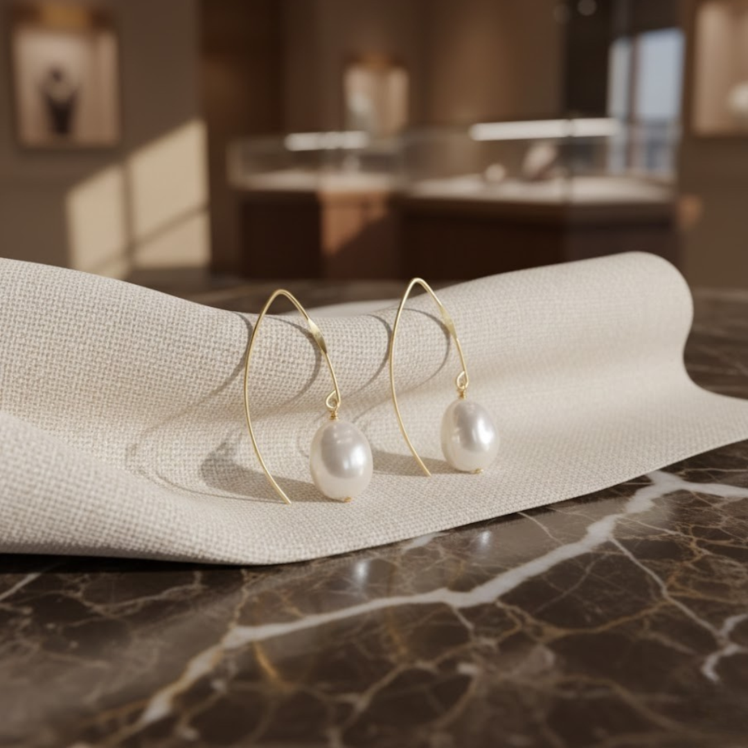 Den elegante, buede wire-silhuetten gir et lett og svevende uttrykk, mens de store perlene tilfører et kunstnerisk og organisk preg. Resultatet er et smykke som fremhever både personlighet og stil – subtilt, sofistikert og tidløst.